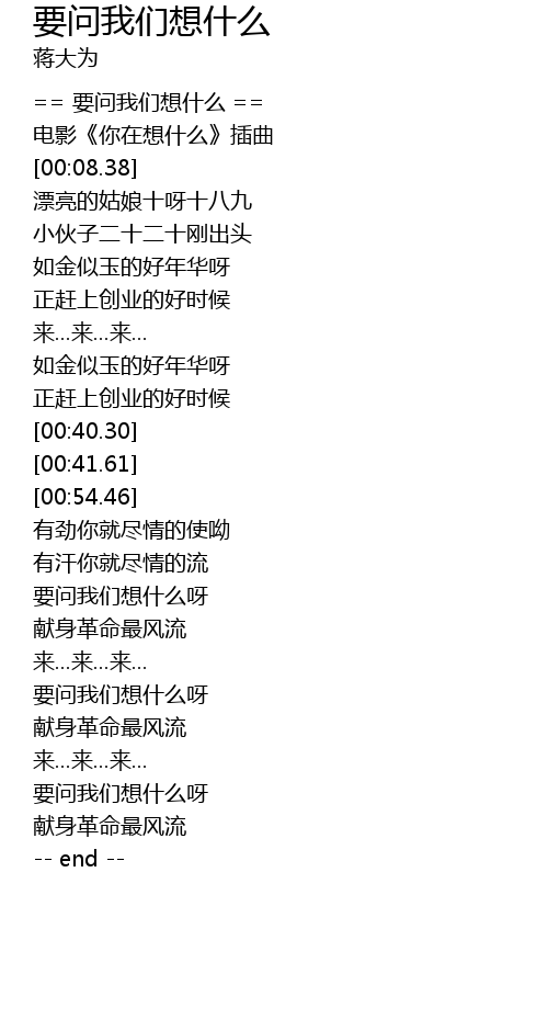 | [01:33.99] | yao wen wo men xiang shen me ya |