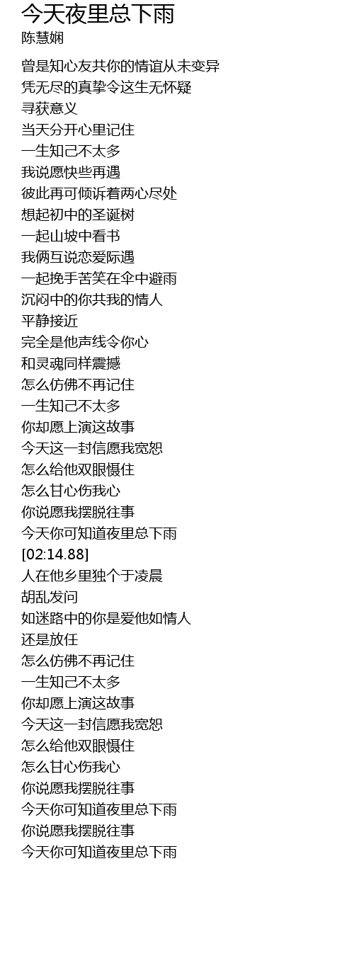 | [03:14.61] | 今天你可知道夜里总下雨 |