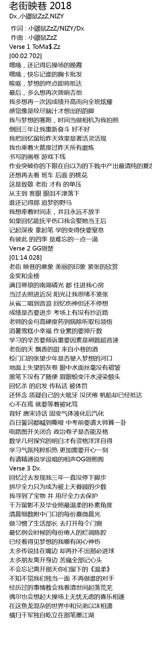 | [01:26.244] | 老街 映巷的意象 美丽的印象 紧张的欣赏 金奖和金榜 |