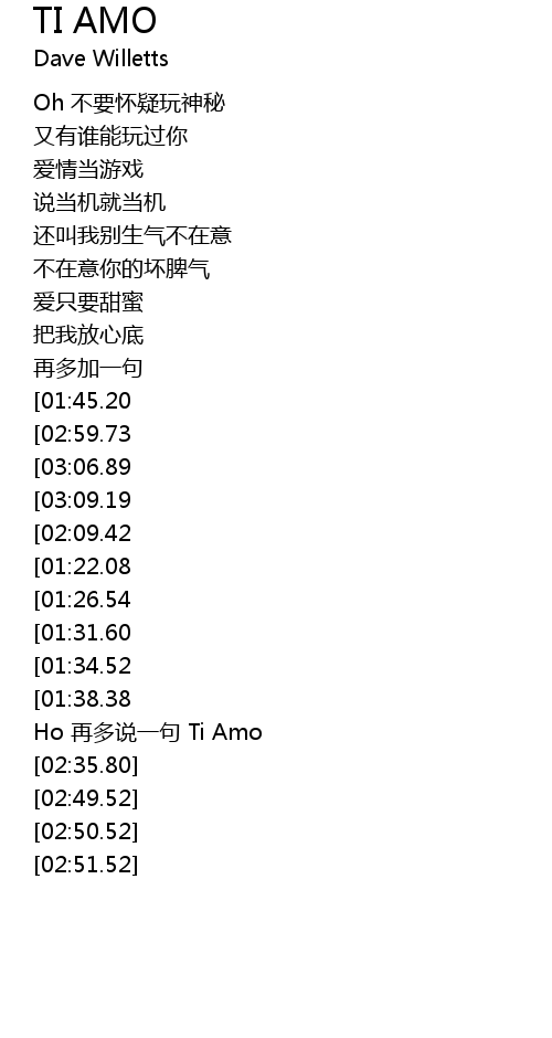 | [02:52.52][01:45.20][00:50.43] | Ti Amo,Oh Ya~I love you |