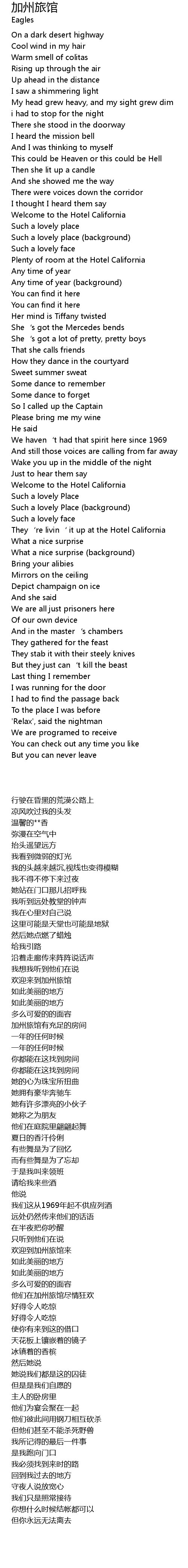 | [04:29.940] | They' re livin' it up at the Hotel California |