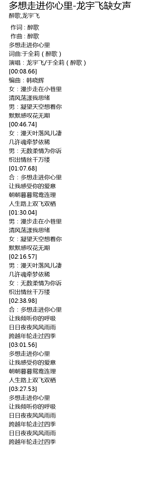 | [00:07.26] | 演唱:龙宇飞/于全莉(醉歌) |