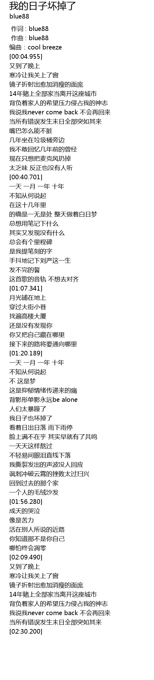 | [01:36.277] | wǒ rì zi yě huài diào le |