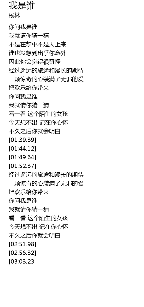 | [00:15.54] | nǐ wèn wǒ shì shuí |