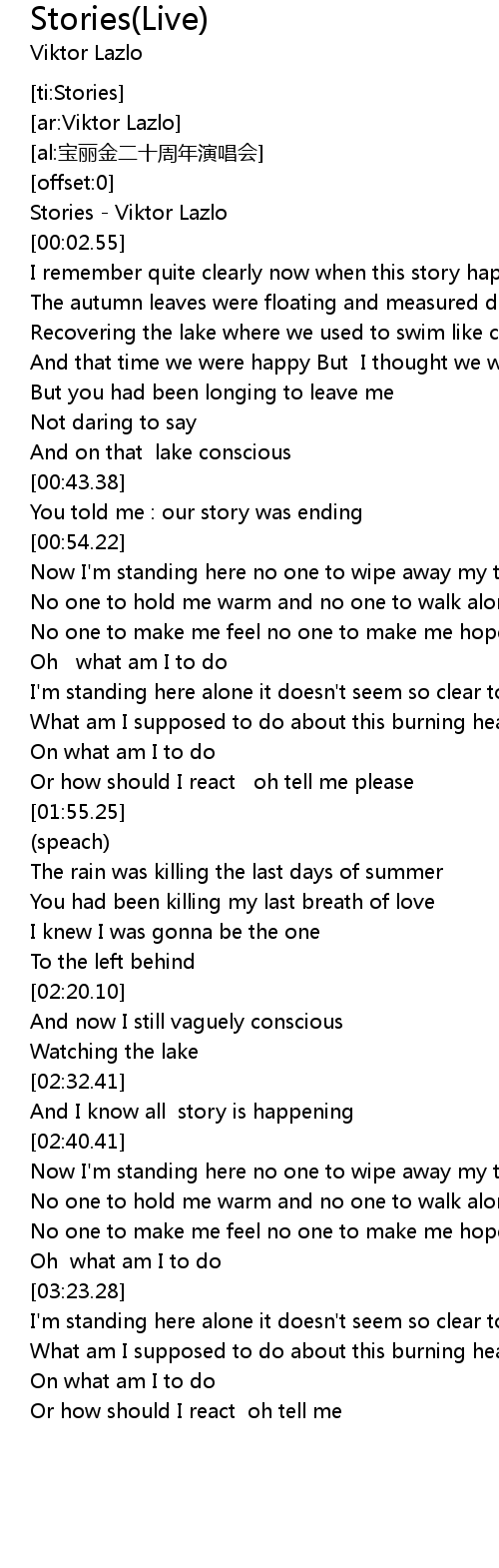 | [02:57.42] | Now I'm standing here no one to wipe away my tears |