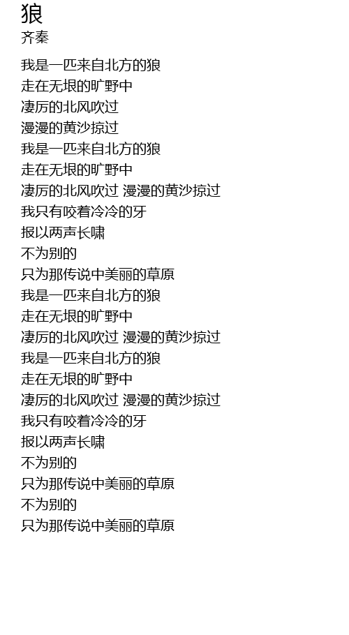| [00:29.750] | 我是一匹来自北方的狼 |