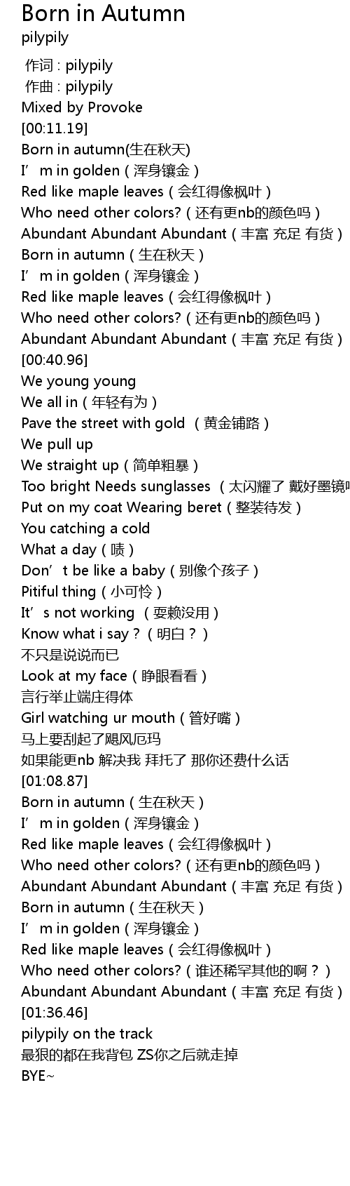 | [01:23.26] | Born in autumn shēng zài qiū tiān |