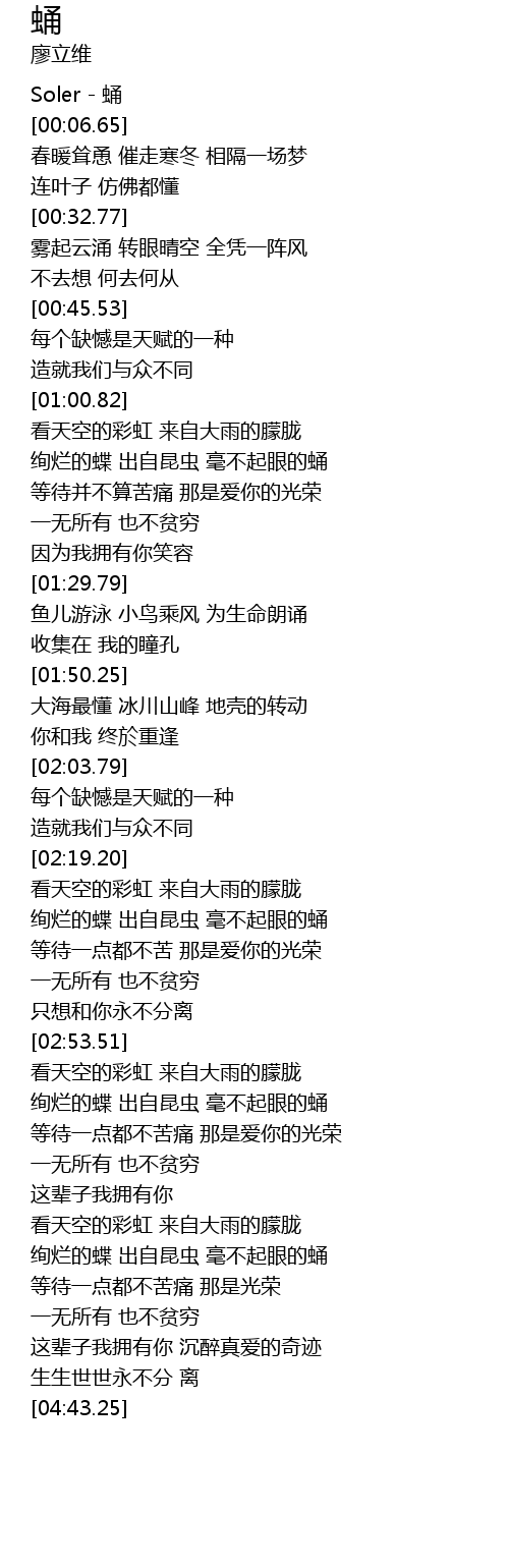| [03:43.41] | 绚烂的蝶 出自昆虫 毫不起眼的蛹 |