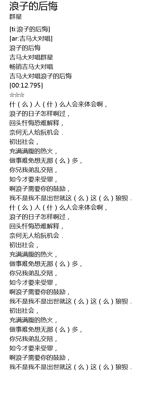 | [00:10.924] | 吉马大对唱浪子的后悔 |