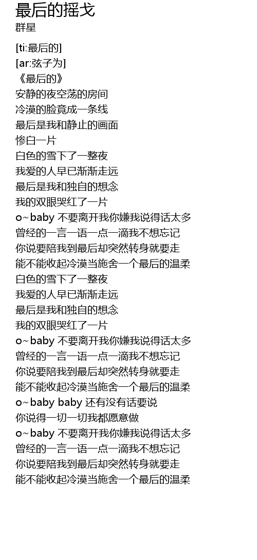 | [01:16.398] | o baby bú yào lí kāi wǒ nǐ xián wǒ shuō de huà tài duō |