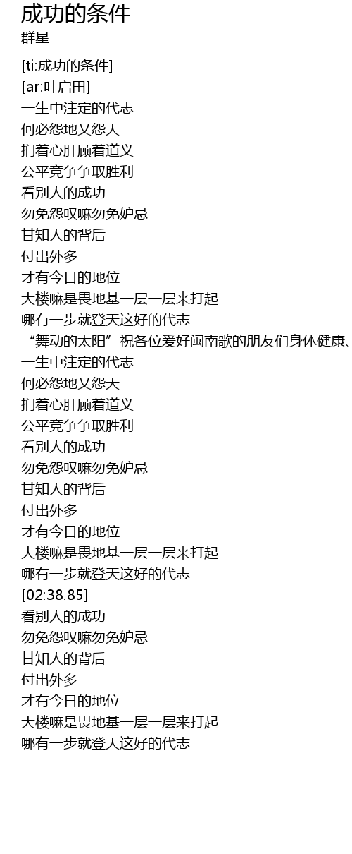 | [01:25.15] | “舞动的太阳”祝各位爱好闽南歌的朋友们身体健康、万事顺心! |