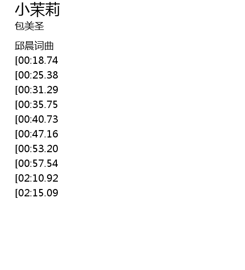 | [02:19.33][02:10.92][01:11.20][01:02.41] | 小茉莉 请不要把我忘记 |