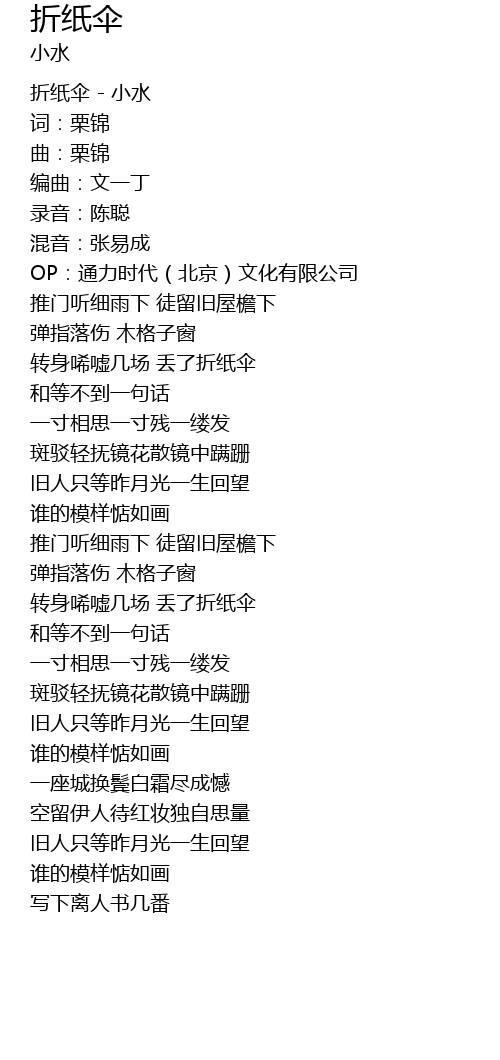 | [00:32.40] | 转身唏嘘几场 丢了折纸伞 |