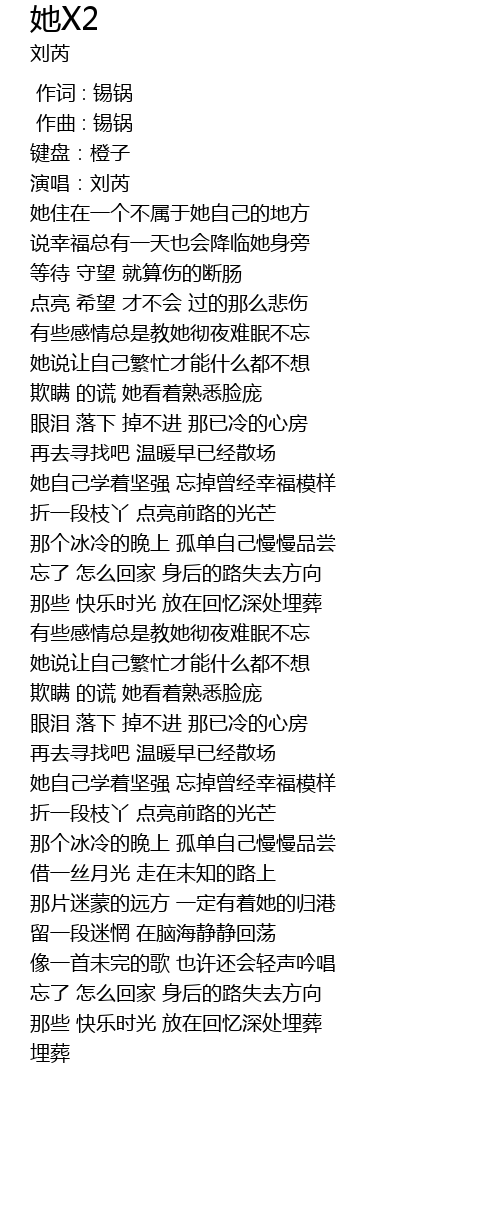 | [02:59.941] | 她自己学着坚强 忘掉曾经幸福模样 |