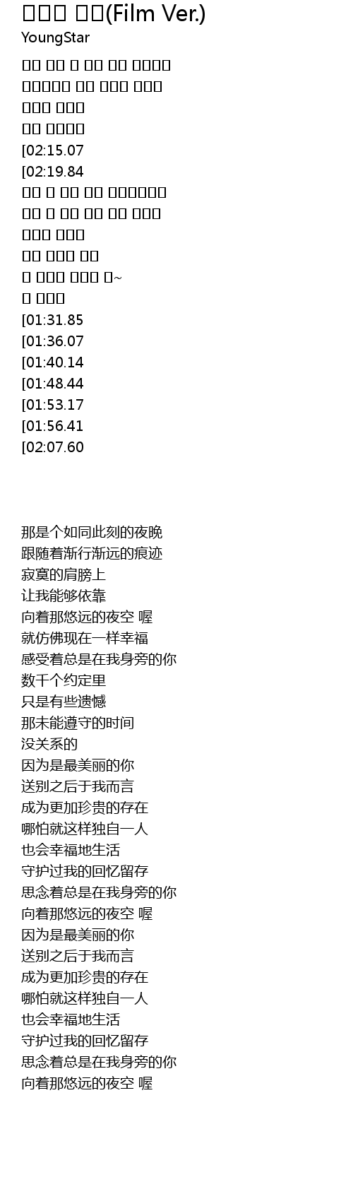 | [03:37.05][02:15.07][00:42.24] | 아주 머나먼 밤 하늘로 오 |