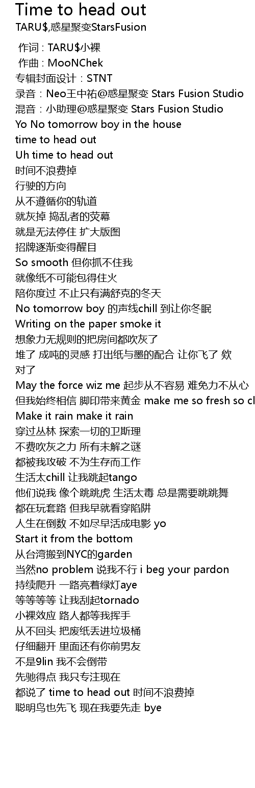 | [01:52.930] | dou shuo le time to head out shi jian bu lang fei diao |