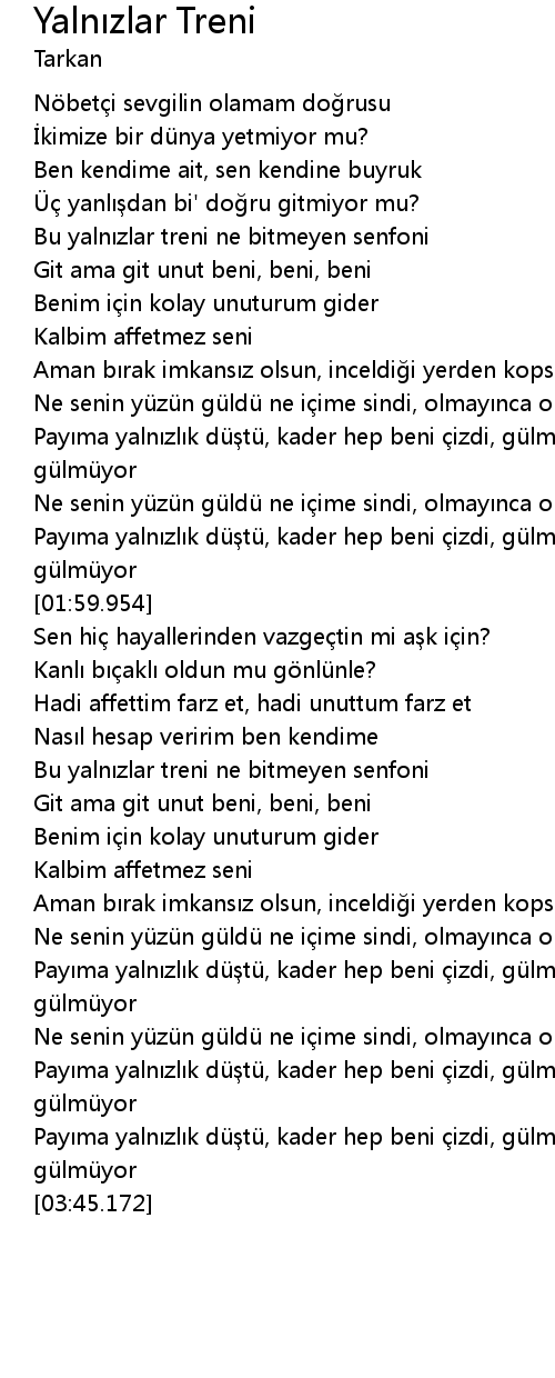 | [00:56.855] | Bu yalnızlar treni ne bitmeyen senfoni |
