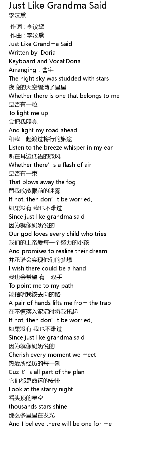 | [02:16.762] | yīn wèi jiù xiàng nǎi nǎi shuō de |