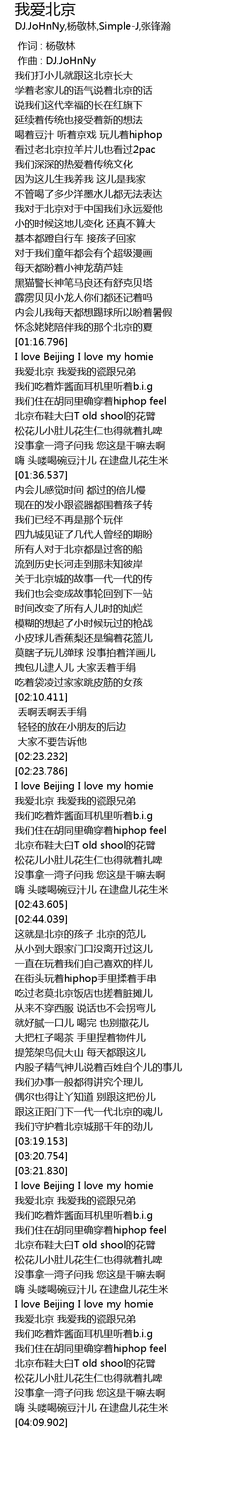| [01:21.748] | 我爱北京 我爱我的瓷跟兄弟 |