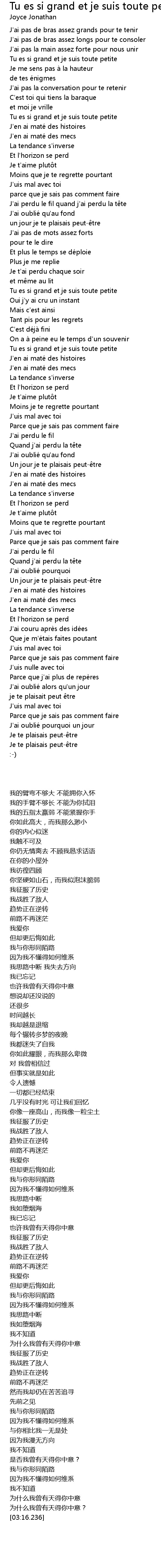 | [00:40.386] | Tu es si grand et je suis toute petite |