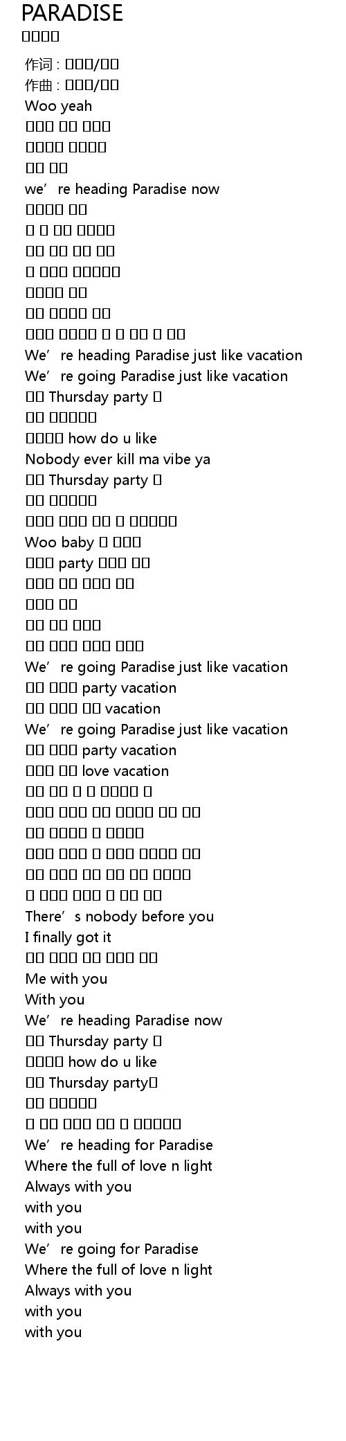 | [01:03.247] | We' re heading Paradise just like vacation |
