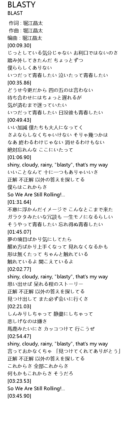 | [02:03.20] | shiny, cloudy, rainy, " blasty", that' s my way |
