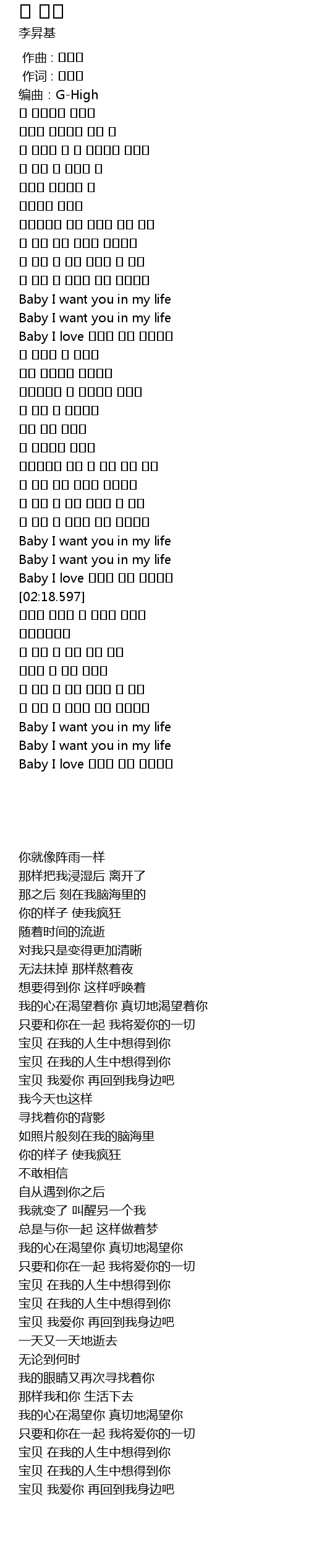 | [02:09.807] | Baby I love 내게로 다시 돌아와줘 |