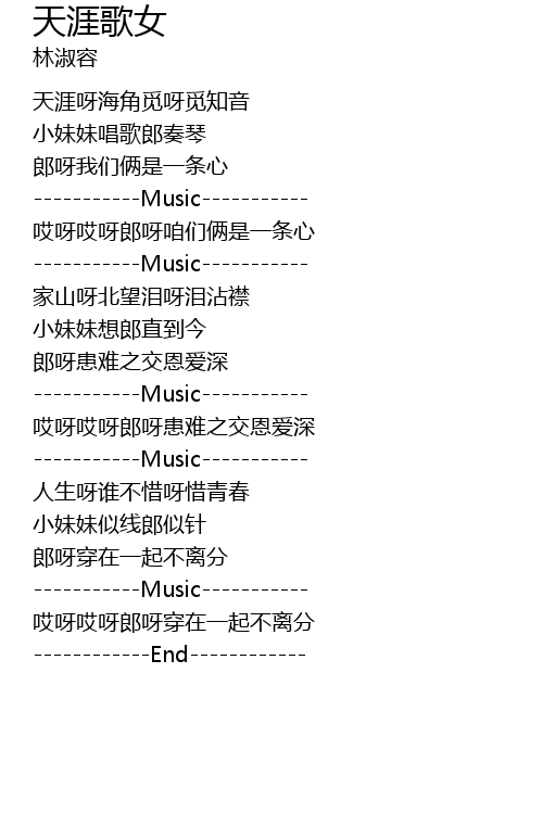 | [00:19.33] | 天涯呀海角觅呀觅知音 |