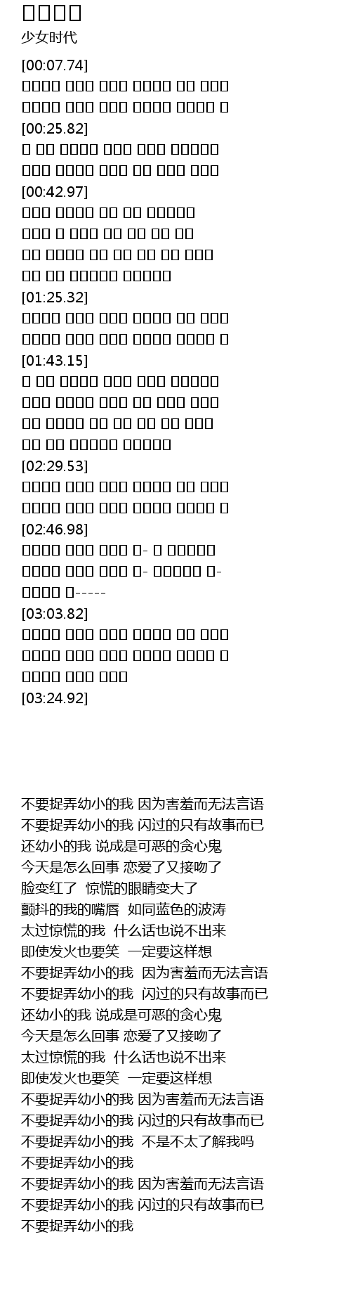 | [03:04.40] | 어리다고 놀리지 말아요 수줍어서 말도 못하고 |
