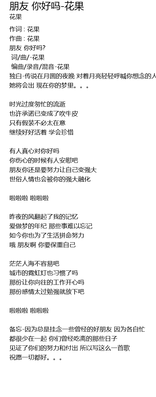 | bèi wàng yīn wèi zǒng shì guà niàn yī xiē céng jīng de hǎo péng you yīn wèi gè zì máng dōu hěn shǎo zài yì qǐ nǐ men céng jīng chī zhāi de nèi xiē rì zi jiàn zhèng le nǐ men de nǔ lì hé fù chū suǒ yǐ xiě zhè me yī shǒu gē zhù yuàn yī qiè dōu hǎo... |
