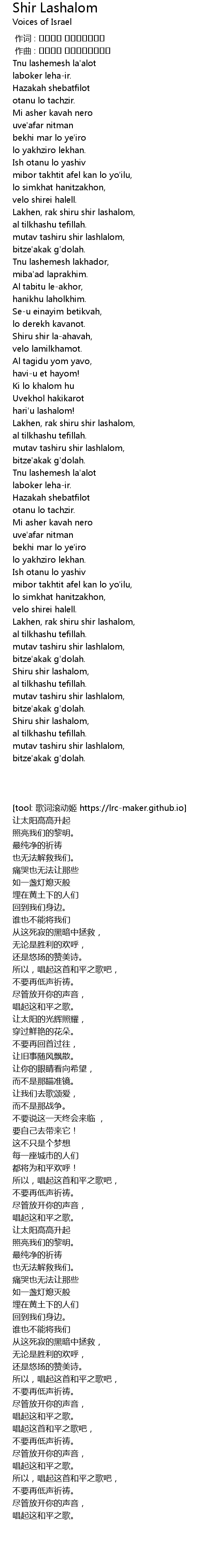 | [03:19.827] | Lakhen, rak shiru shir lashalom, |