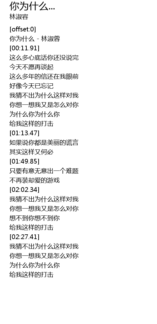 | [00:02.09] | 你为什么 - 林淑蓉 |