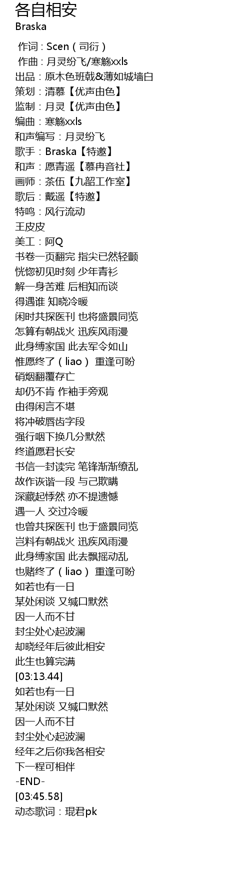 | [03:32.69] | jīng nián zhī hòu nǐ wǒ gè xiāng ān |