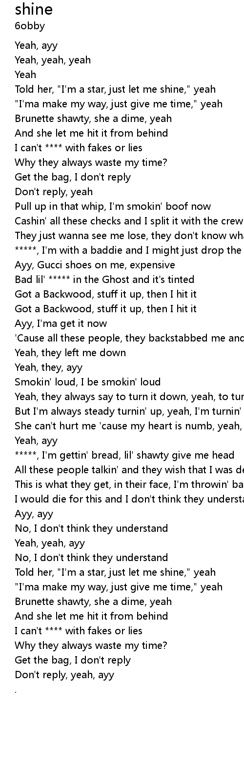 | [01:51.442] | Told her, "I'm a star, just let me shine," yeah |