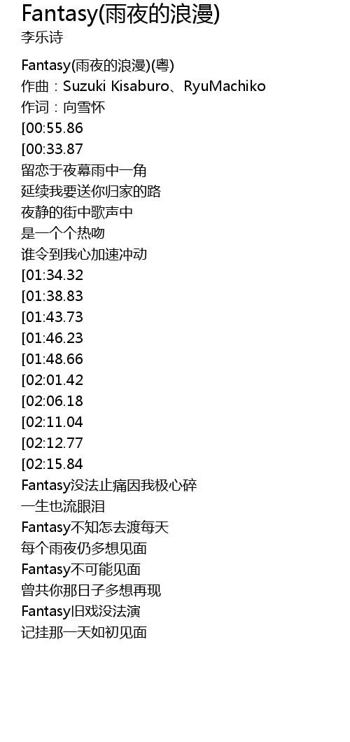 | [00:10.35][00:55.86][01:18.17][01:52.37][03:02.79][04:00.61] | 李乐诗-Fantasy(雨夜的浪漫)(粤) |