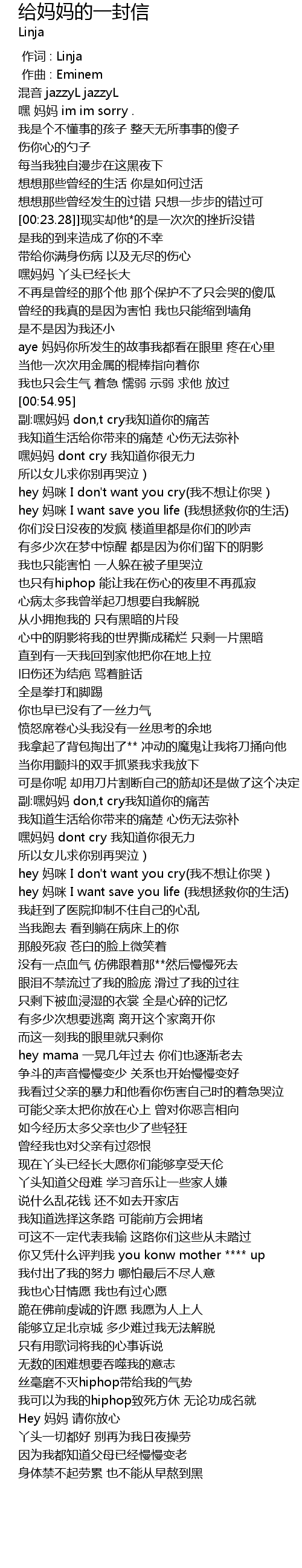 | [01:18.32] | hey 妈咪 I don't want you cry(我不想让你哭) |