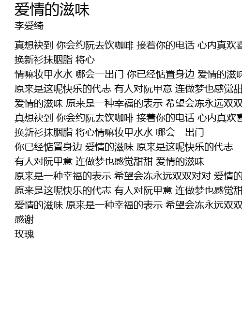 | 情嘛妆甲水水 哪会一出门 你已经惦置身边 爱情的滋味 原来是这呢快乐的代志 有人对阮甲意 连做梦也感觉甜甜 爱情的滋味 原来是一种幸福的表示 希望会冻永远双双对对 真想袂到 你会约阮去饮咖啡 接着你的电话 心内真欢喜 换新衫抹胭脂 将心情嘛妆甲水水 哪会一出门 你已经惦置身边 爱情的滋味 原来是这呢快乐的代志 有人对阮甲意 连做梦也感觉甜甜 爱情的滋味 原来是一种幸福的表示 希望会冻永远双双对对 爱情的滋味 原来是这呢快乐的代志 有人对阮甲意 连做梦也感觉甜甜 爱情的滋味 原来是一种幸福的表示 希望会冻永远双双对对 | |