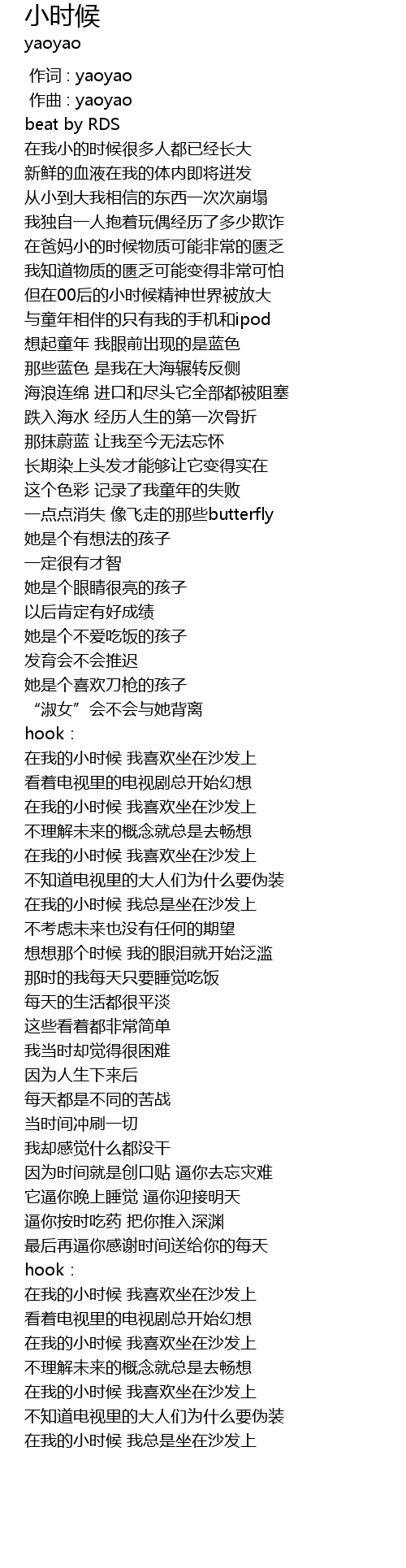 | [01:56.135] | zài wǒ de xiǎo shí hòu wǒ xǐ huān zuò zài shā fā shàng |