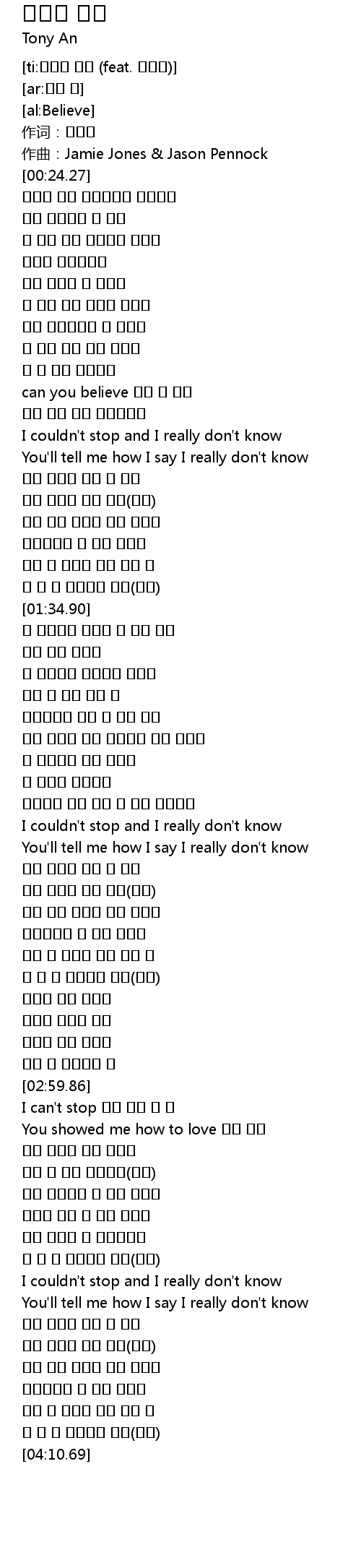 | [00:54.07] | can you believe 숨길 수 없어 |
