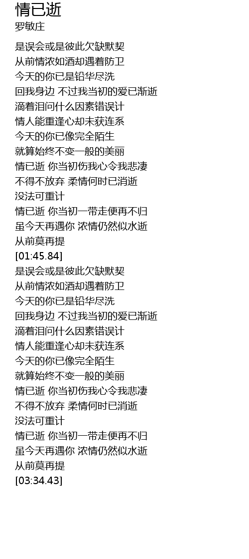 | [03:14.42] | 情已逝 你当初一带走便再不归 |