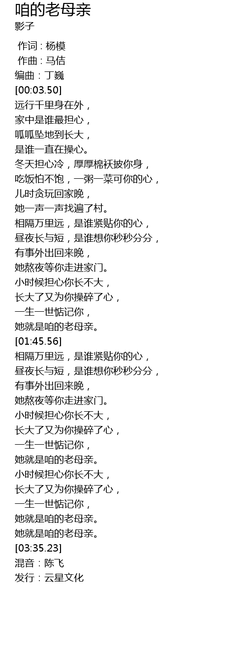 | [03:25.95] | tā jiù shì zán de lǎo mǔ qīn. |