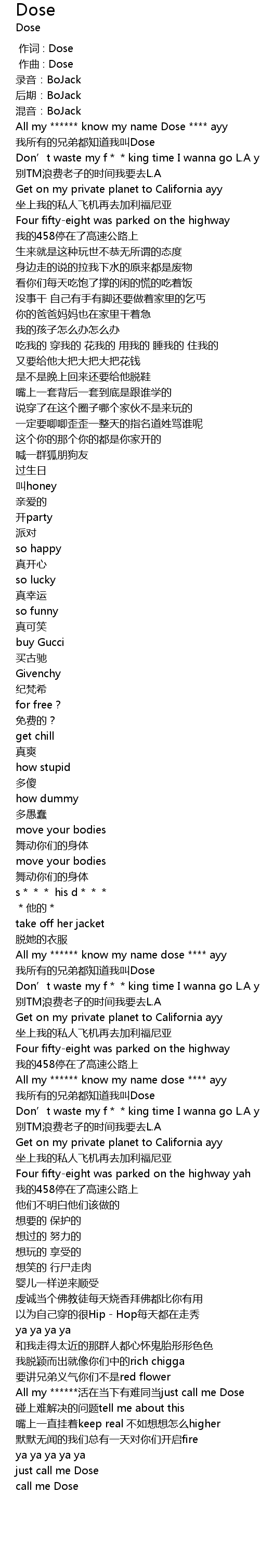 | [02:03.693] | All my ******活在当下有难同当just call me Dose |