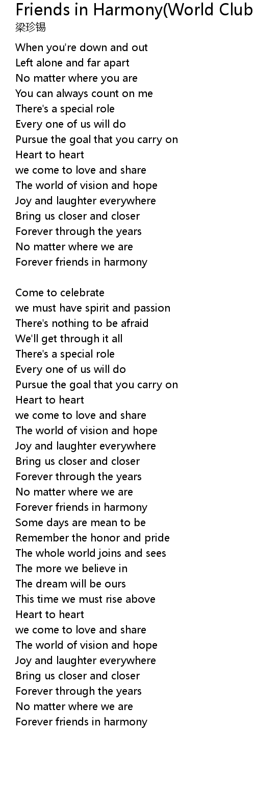 Friends in Harmony(World Club Championship 대회주제가) Friends in Harmony World Club Championship Lyrics