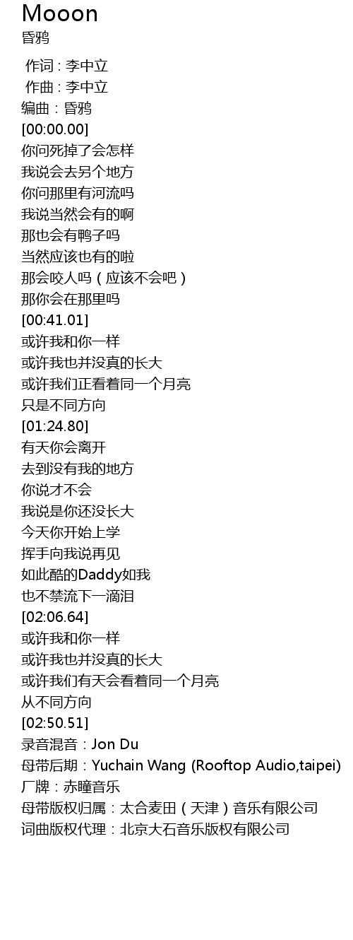 | [02:55.49] | mǔ dài bǎn quán guī shǔ: tài hé mài tián tiān jīn yīn yuè yǒu xiàn gōng sī |