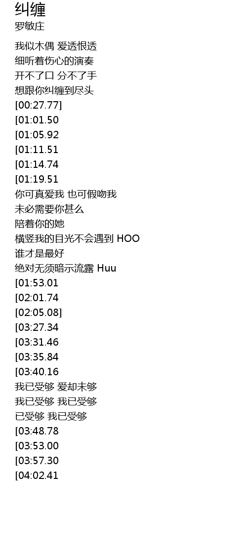 | [04:16.74][03:27.34][02:05.97] | 我似木偶 爱透恨透 |