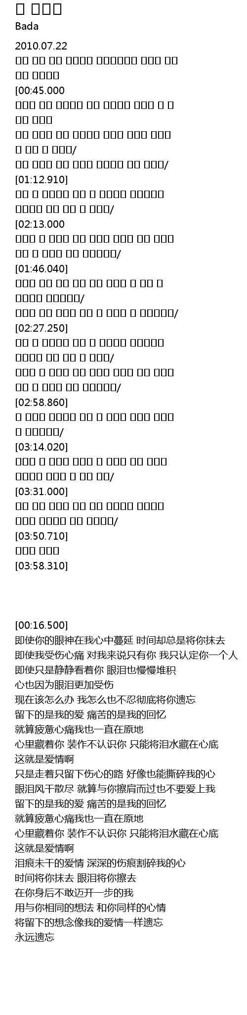 시간은 널 지우려 눈물은 널 씻으려 너의 뒤에서 한걸음도 움직일 수 없는 나를/ |