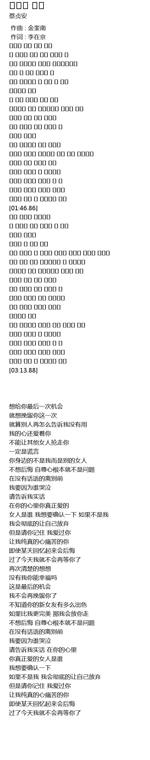 | [02:14.54] | 너의 새로운 그 여자가 얼마나 괜찮은 여잔지 몰라도 |