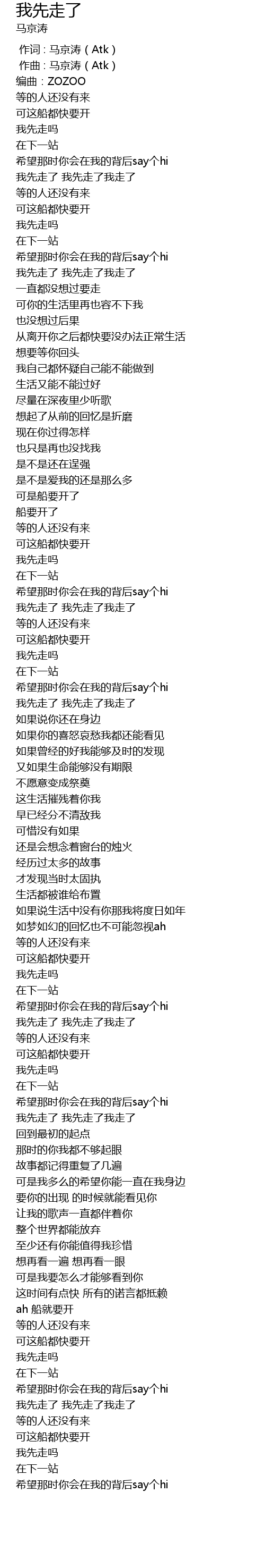 | [00:11.42] | wǒ xiān zǒu le wǒ xiān zǒu le wǒ zǒu le |