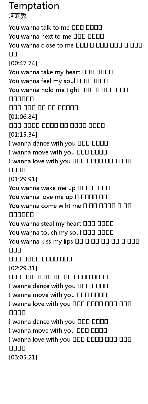 | [02:59.97] | I wanna love with you 이밤이 다가도록 그속에 내몸이 다타도록 |