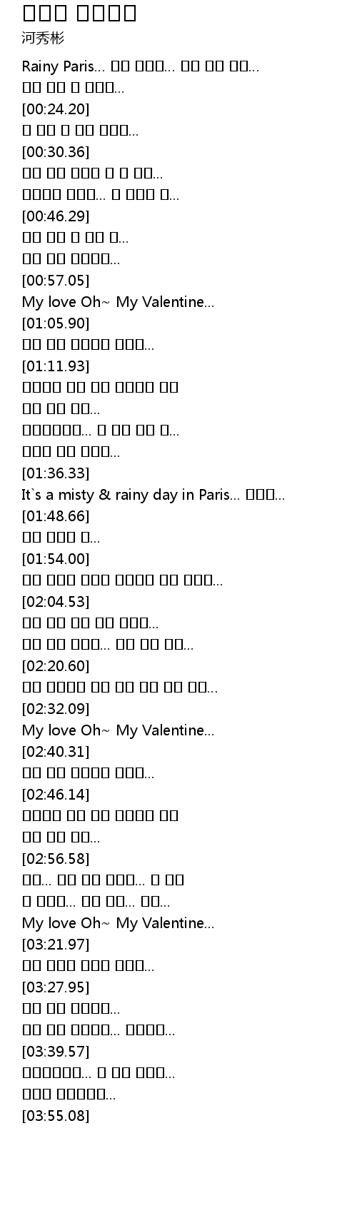 | [00:08.29] | Rainy Paris… 여긴 비가와… 별일 없는 거지… |